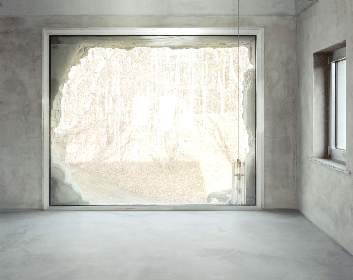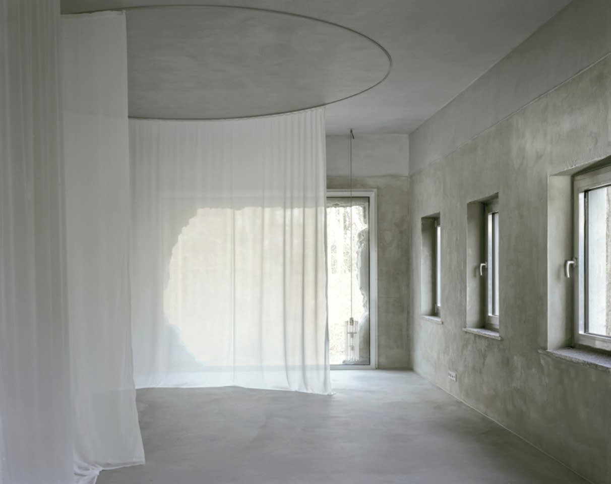 Inspired by Claude Faraldo’s experimental film Themroc (1973), big holes were punched into the walls facing the lake and forest, replacing the existing windows on that facade, to gain maximum openness and exposure to the landscape. The interior space is characterized by monochromatic surfaces. A sauna stove functions as the space’s supplemental heating point, around which translucent curtains can be drawn to create different zones during especially cold months.