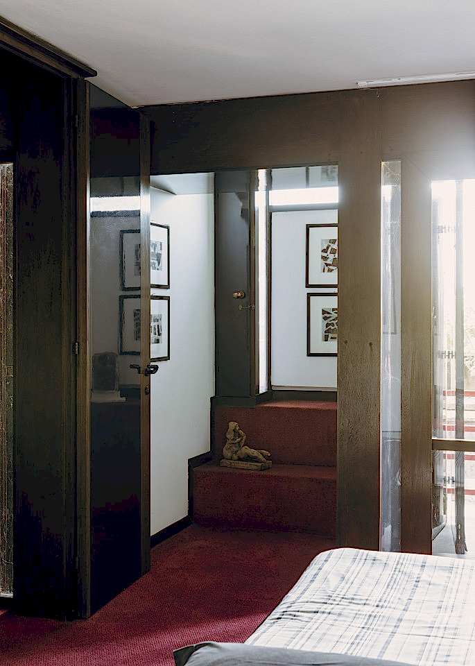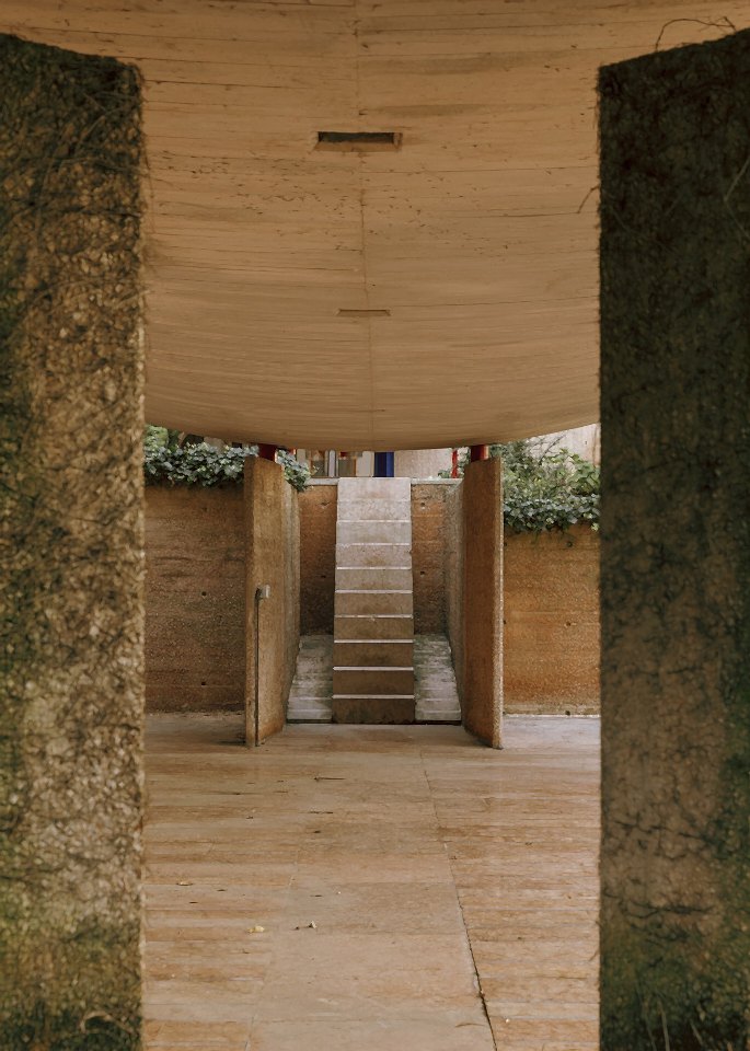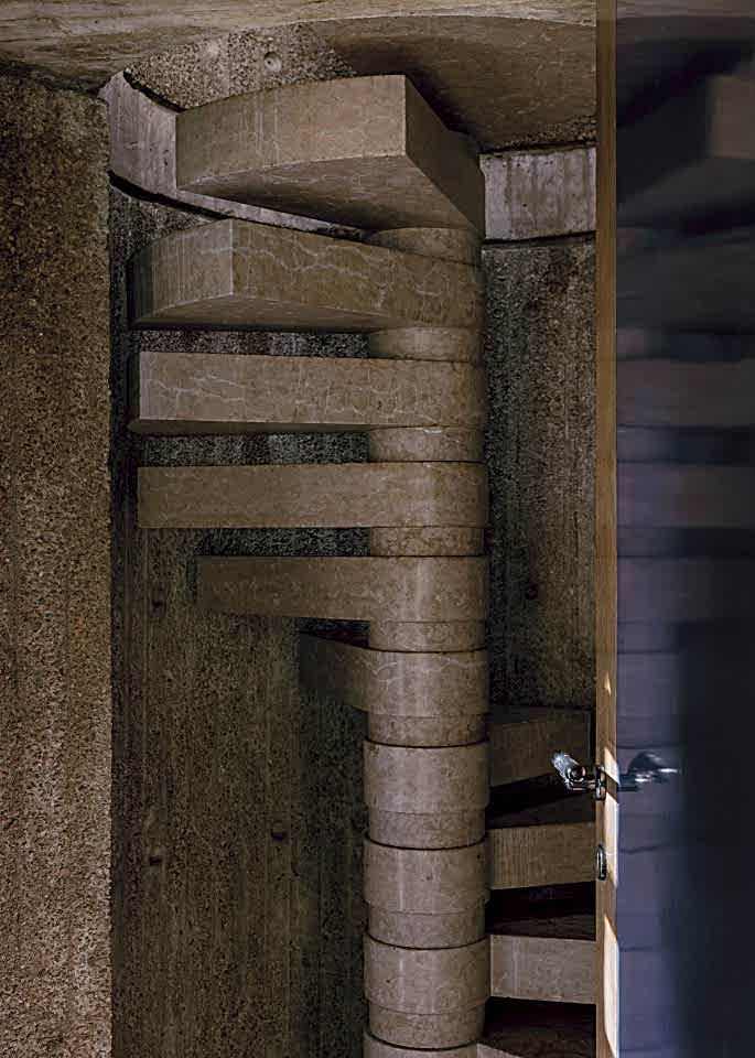 The interior architecture is defined by its simplicity and natural texture. Arched doorways and irregular plaster walls frame each room, giving the space a sculptural, handcrafted feel. The windows are modest but well-placed, allowing gentle, directional light to wash across the aged surfaces. Staircases are raw and almost monolithic, blending seamlessly into the structure. Every corner feels intentionally imperfect, lending itself perfectly to cinematic storytelling or editorial stills.