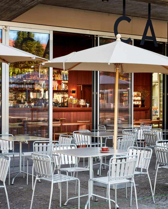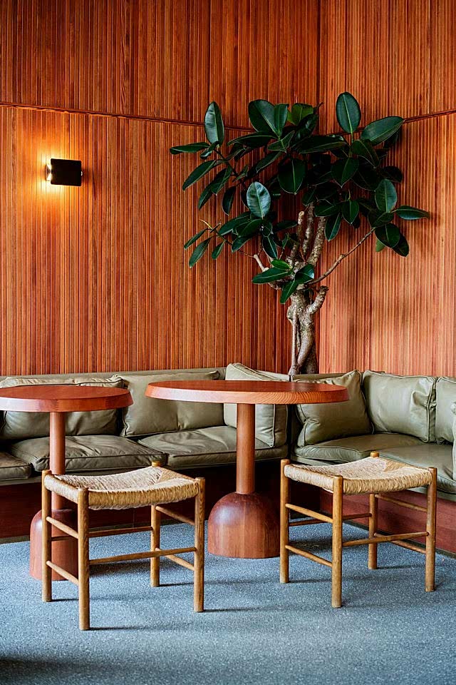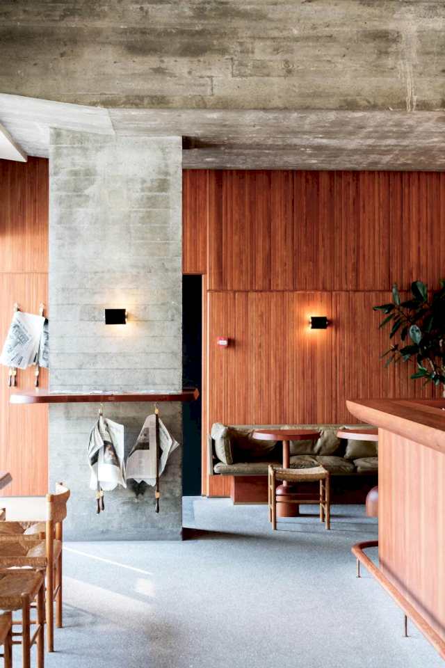 The room is filled with a tropical atmosphere. The exceptionally long wooden bar surface, made in Italy, creates an attractive and compelling atmosphere. Its powerful shape and soft surface are simply seductive. A light presence of Le Corbusier's ideas resonates in the room - a touch of Brazil.