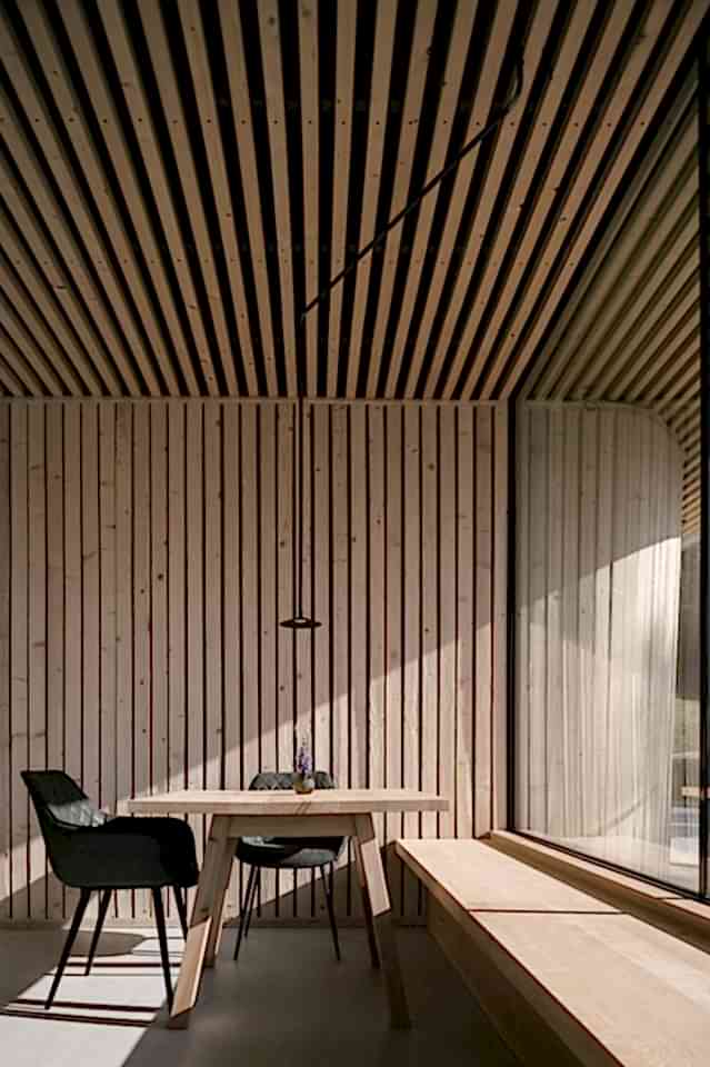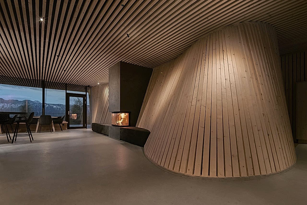 This thread also continues in the interiors. Clad with natural spruce, individual loop-like elements resurface on the walls. The stone-grey cement floor is reminiscent of the rugged mountains that surround the hotel, and contrasts with the soft textiles and fabrics that give the house a certain rusticity.