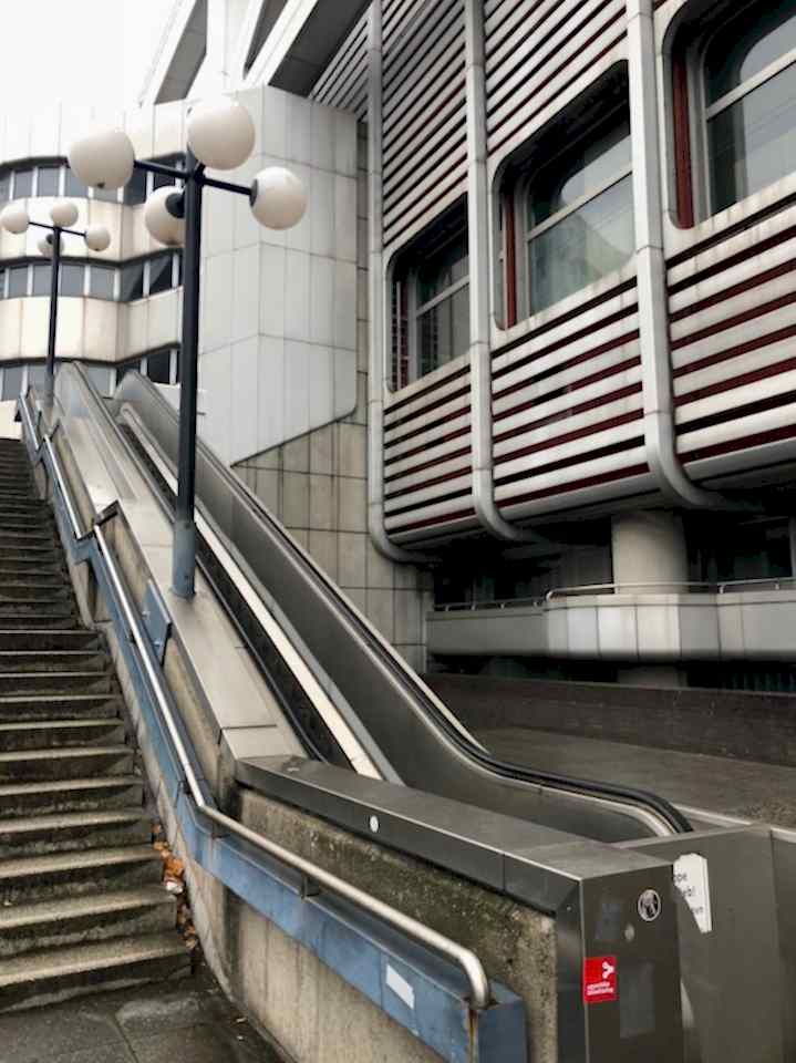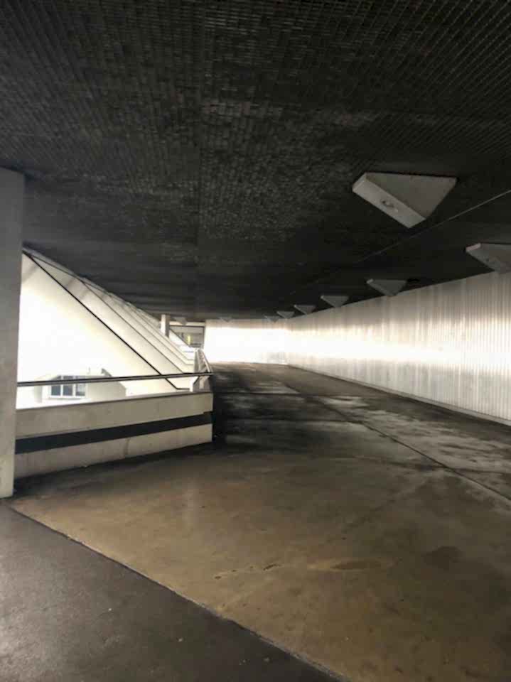 Massive overhangs and cantilevered corridors create striking lines and depth, while the various levels โ from the elevated walkways to the cavernous underpasses โ offer diverse moods and geometries. The colour palette is mostly steely grey, punctuated by oxidised metal, industrial signage, and raw concrete. Whether shooting wide-angle scenes or abstract architectural close-ups, the ICCโs exterior is a masterclass in bold design and spatial drama.