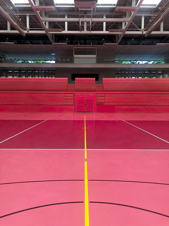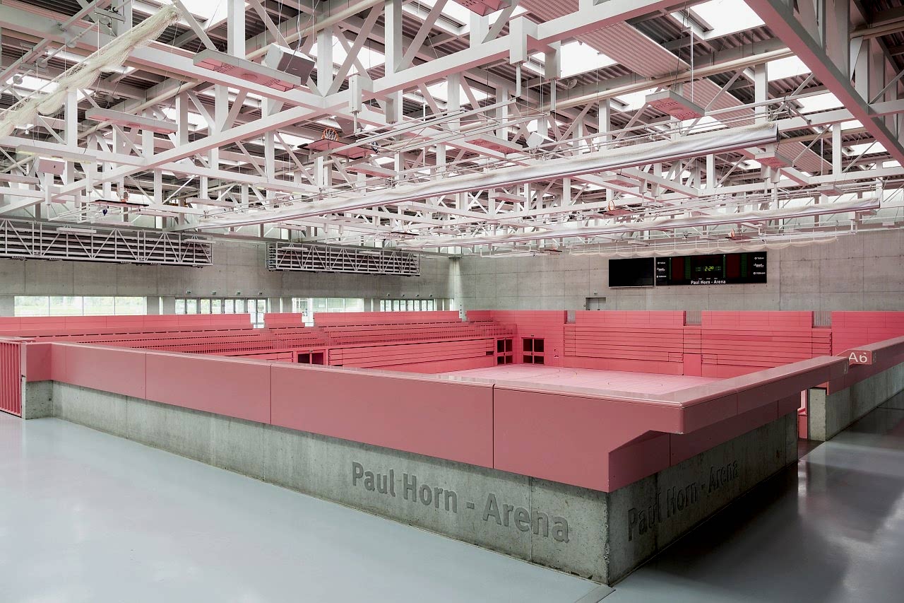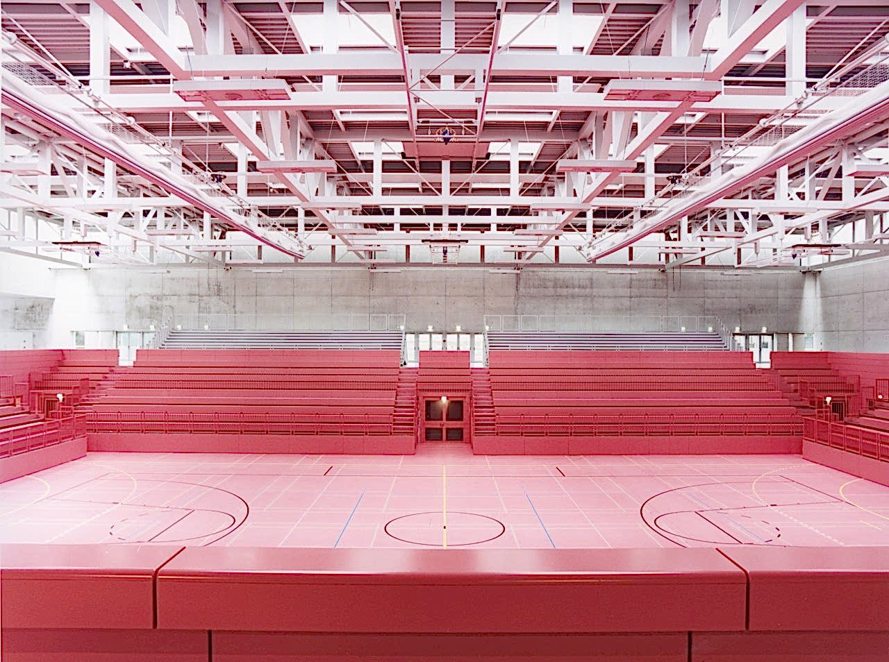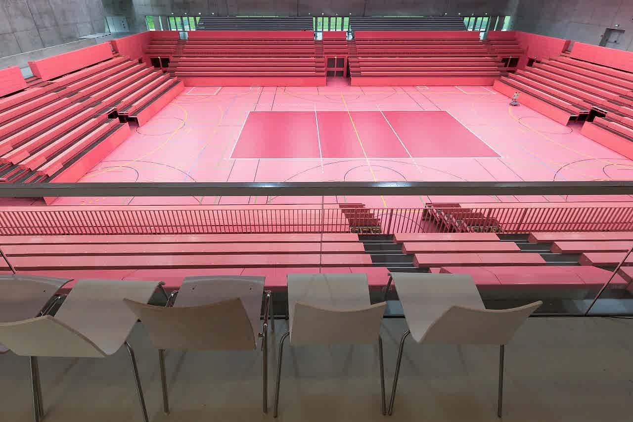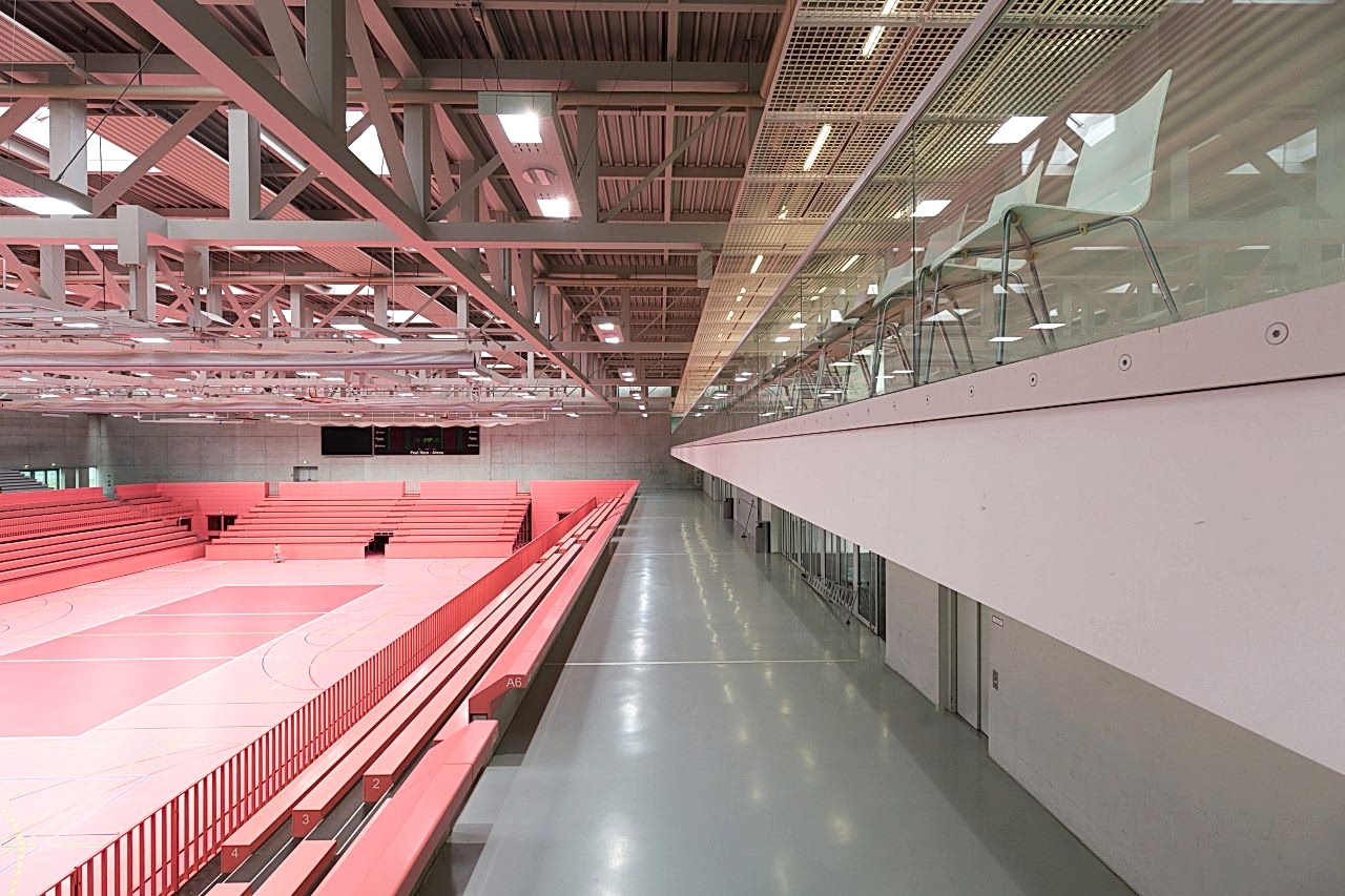 The heterogeneity in the external appearance is contrasted by a homogeneous interior: a magenta-colored, monochrome shell for the central sports and event area with a housing of raw concrete walls. In addition to the photovoltaic façade, an unusual natural ventilation concept for sports halls complements the holistically sustainable approach of the architectural concept.
