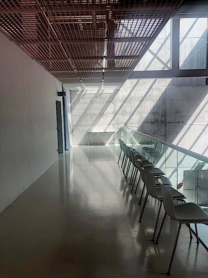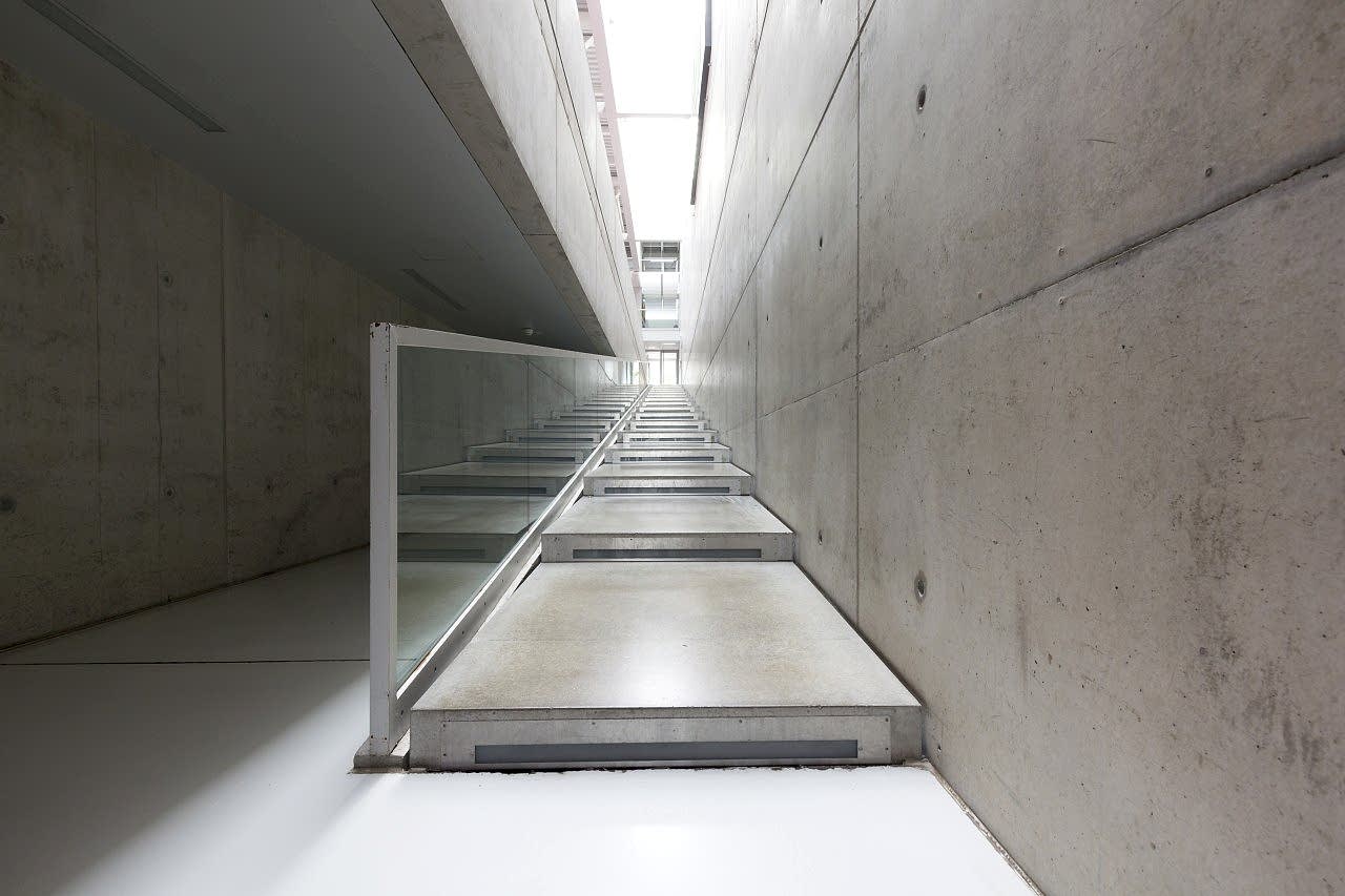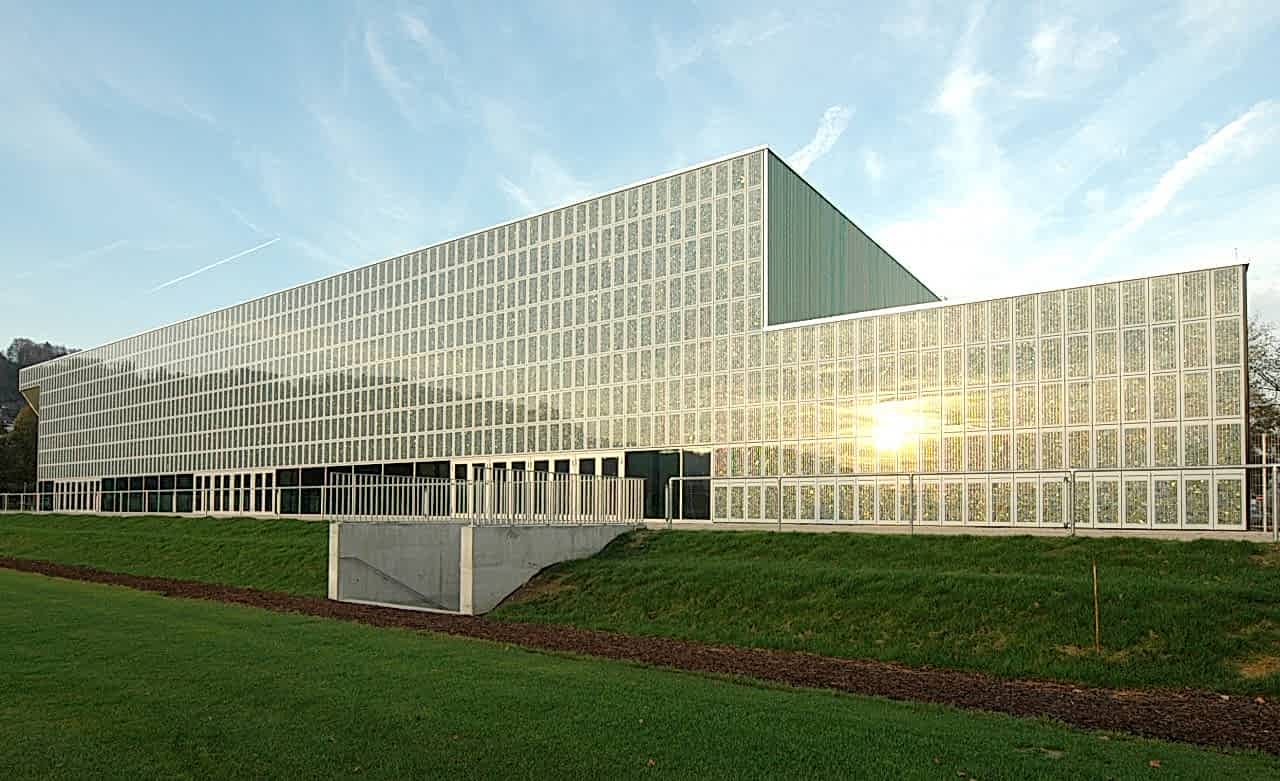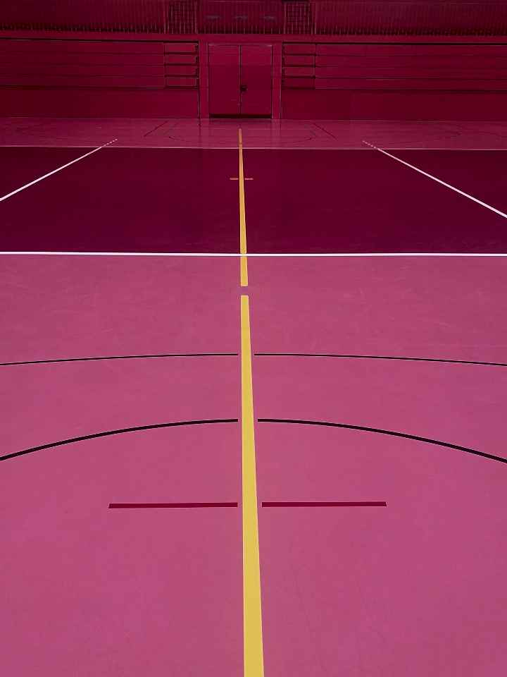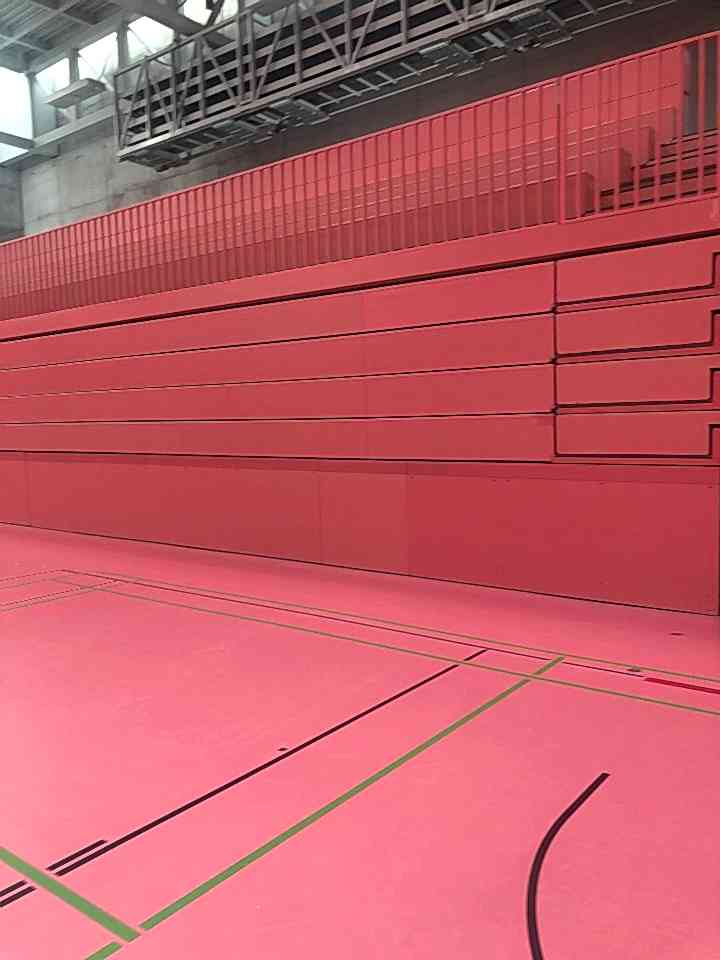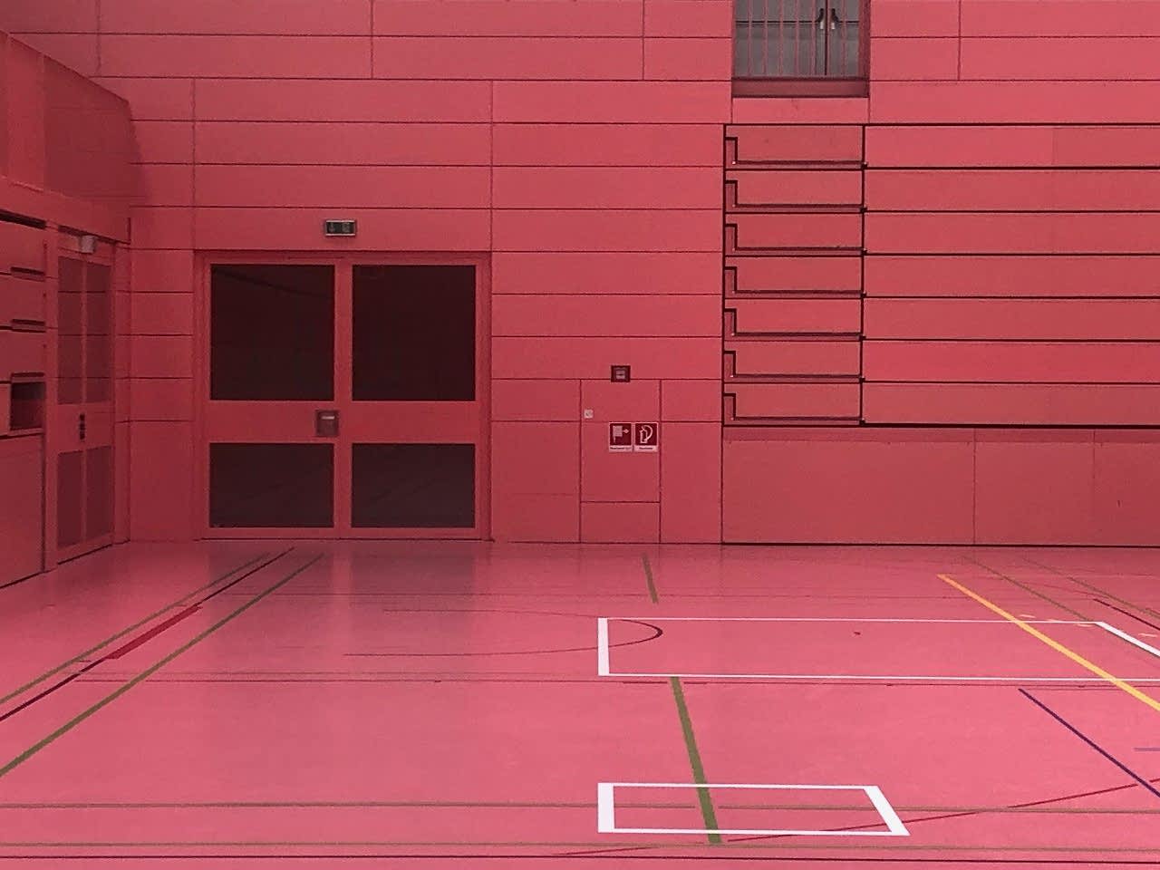 The heterogeneity in the external appearance is contrasted by a homogeneous interior: a magenta-colored, monochrome shell for the central sports and event area with a housing of raw concrete walls. In addition to the photovoltaic façade, an unusual natural ventilation concept for sports halls complements the holistically sustainable approach of the architectural concept.